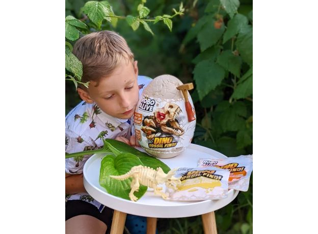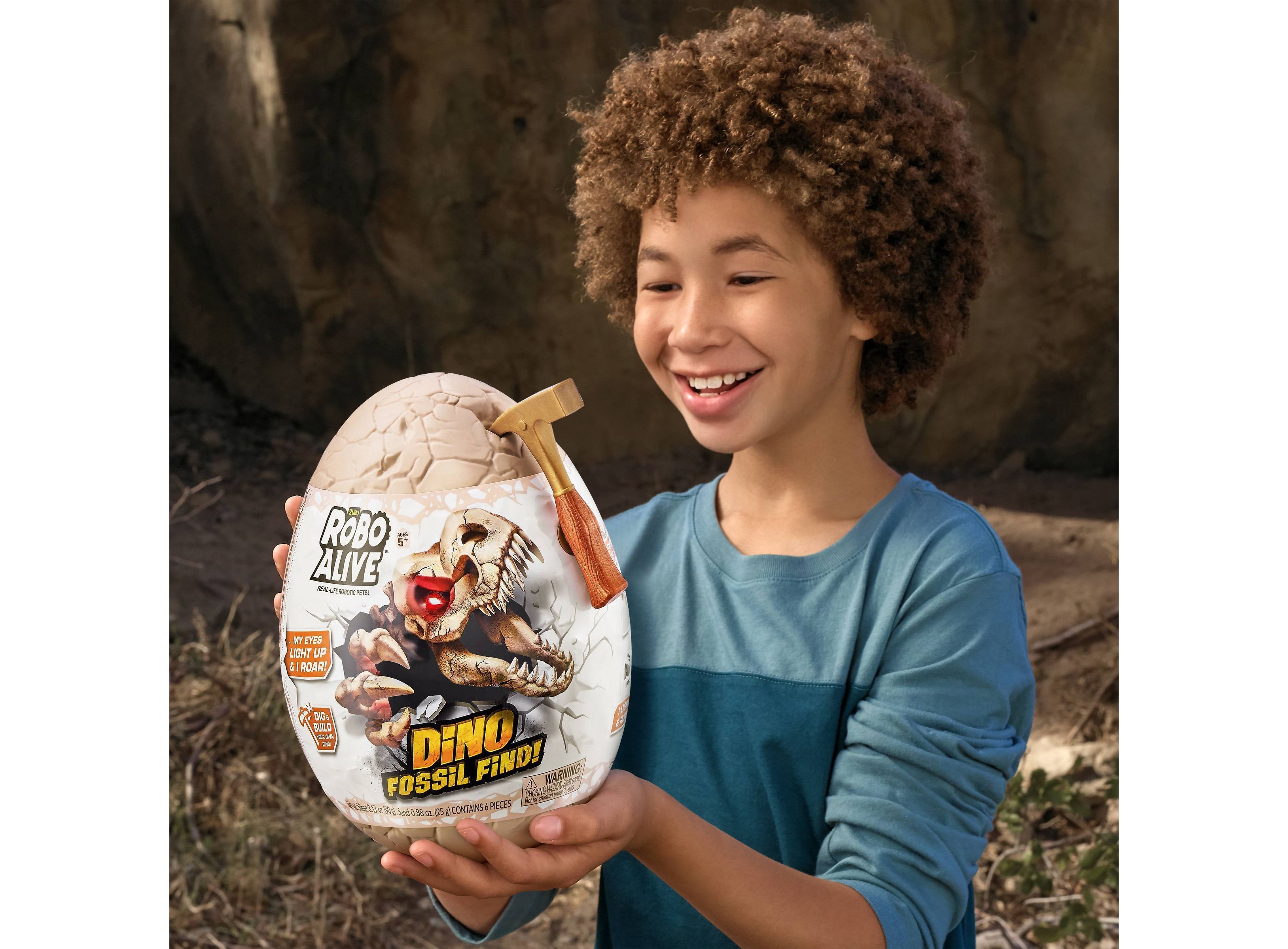 تخم داینوی روبو الایو رو باز کنید و با استفاده از چکش، سنگ داخل اون رو بشکونید تا از دیدن فسیل داینو هیجانزده شید. با باز کردن ماسه و اسلایم، دیگر تیکههای فسیل رو پیدا کنید و با سرهم کردن قطعات ببینید که فسیل کدوم یکی از دایناسورهای ترسناک ماقبل تاریخ رو پیدا کردید؟ تیرکس، تریسراتوپس، آنکیلوسور و یا استگوسور! حالا وقته زنده کردن این موجود شگفتانگیزه؛ کافیه که دُم دایناسور رو فشار بدید تا صدای غرشش رو بشنوید و با نور قرمزی که داخل دهانش روشن میشه، ترس رو به دل دشمنانش بندازید.