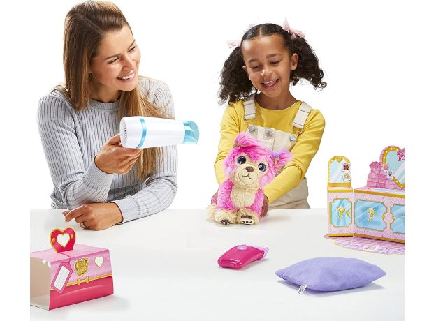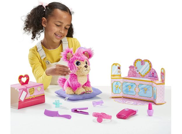 یورکی یا فرنچی؟ برای پیدا کردن حیوون خونگی‌تون، درِ جعبه رو باز کرده و توپ پشمی رو بیرون بیارین. با کمک موزر، شروع به تراشیدن موها کنین و بعد از نمایان شدن کامل صورت هاپوی بانمک‌تون، اون رو به حمام ببرین و با شامپو بچه و آب خوب بشورین. حالا که فهمیدین هاپوتون نژادش یورکی یا فرنچیه، اون رو با باد ولرم سشوار، با دقت و حوصله و به کمک بزرگترها خشک کنین که سرما نخوره. تازه شما با قراردادن موهای اضافه‌ی عروسک‌تون داخل رو بالشتی می‌تونید یه بالشت نرمالو براش درست کنین. حیوون دوست‌داشتنی شما همراه خودش یه میز‌ آرایش مقوایی بانمک داره که توی اون اکسسوری‌های سورپرایزی پنهان شده، که شامل: شونه برای مرتب کردن موها، اتو موی پلاستیکی، دوتا گل‌سر خوشگل و یه ظرف لاک ناخن میشه.